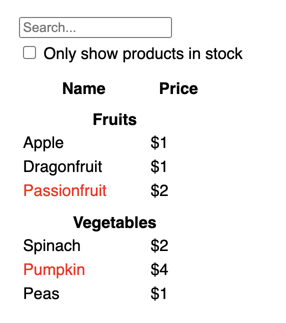 이제 애플리케이션이 어떻게 동작하는지 알 수 있습니다. filterText의 초기 값을 useState('')에서 useState('fruit')로 수정해 보세요. 검색창과 데이터 테이블이 모두 업데이트됨을 확인할 수 있습니다.